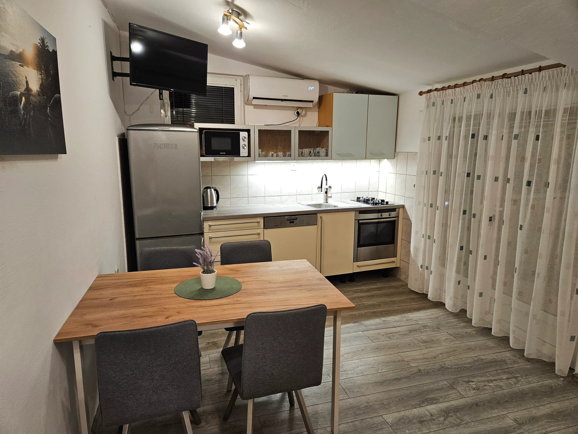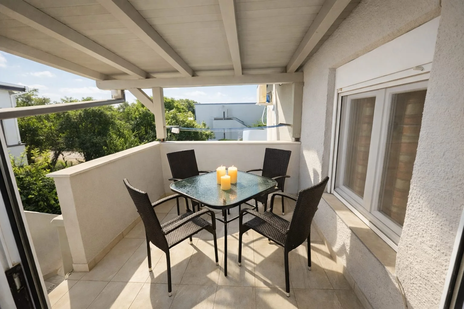 A cozy and modern retreat located on the upper floor, perfect for couples or smaller families seeking a quiet escape. This efficient two-room layout features a private master bedroom with a comfortable double bed. The second room is an open-plan living area and kitchen with a pull-out sofa bed for two. Step outside onto your private terrace, equipped with a table and four chairs for intimate outdoor dining. Despite its compact size, it includes all premium amenities found in our larger suites: a fully equipped kitchen with a dishwasher and fridge, air conditioning, smart TV, and reliable WiFi.